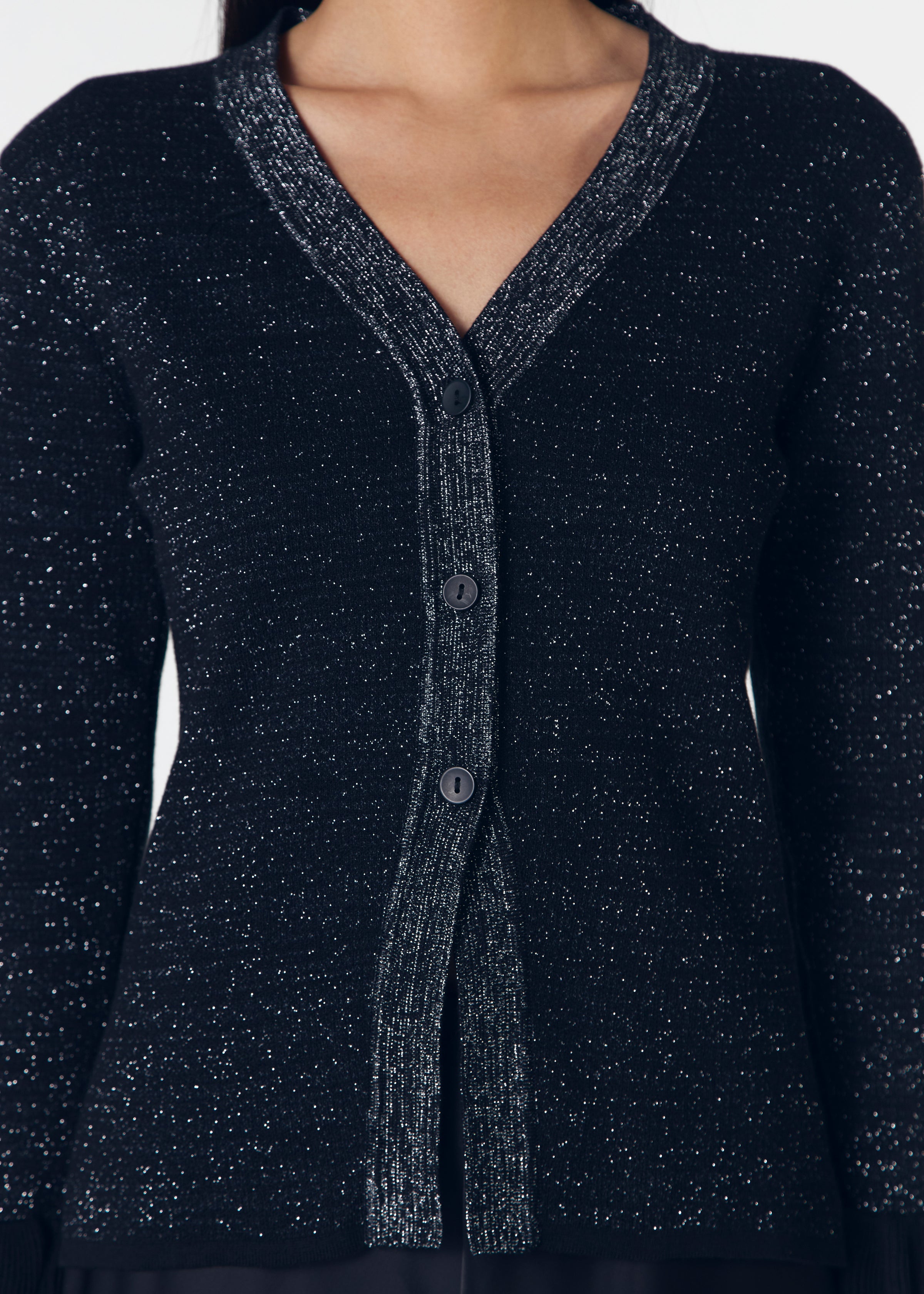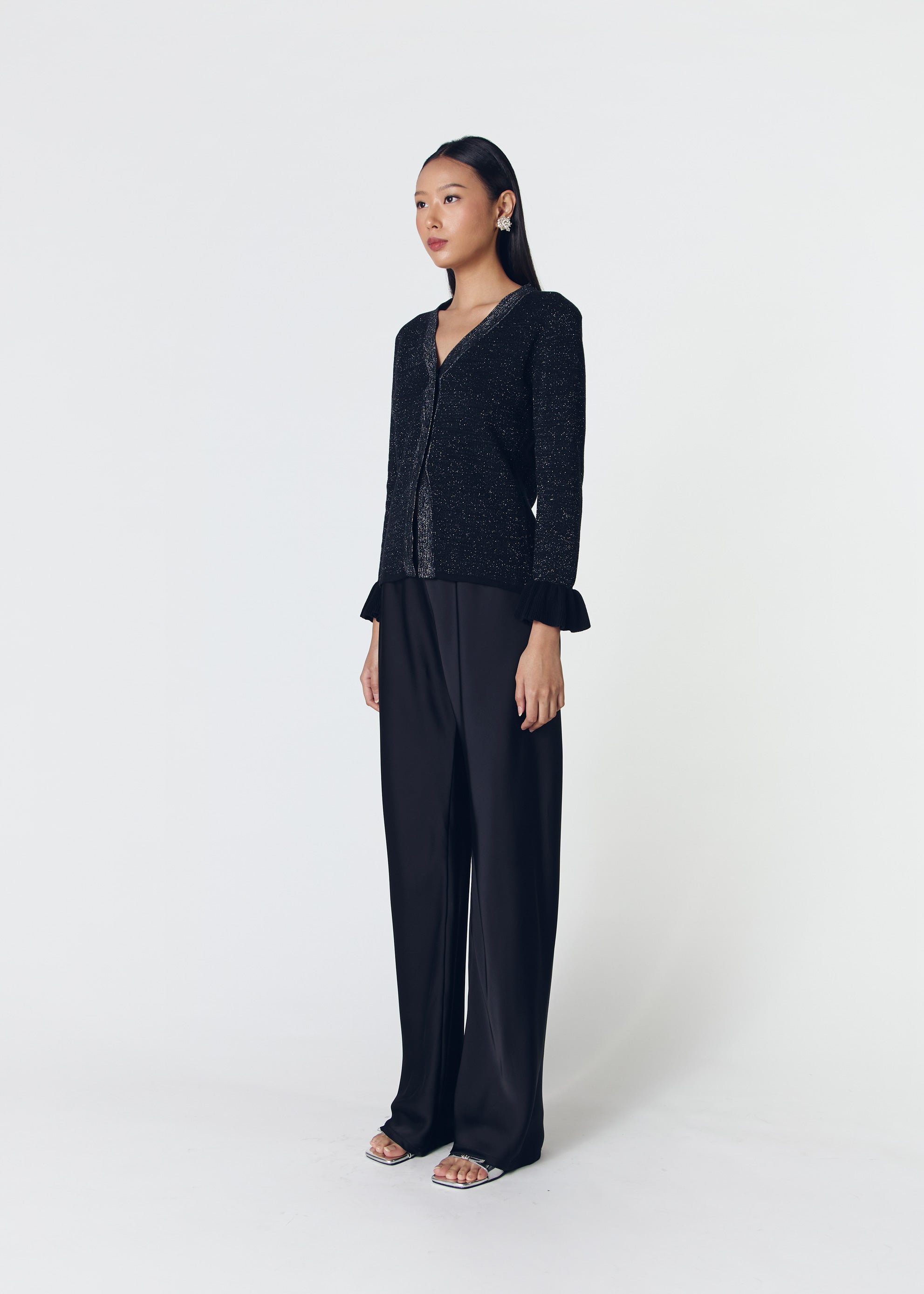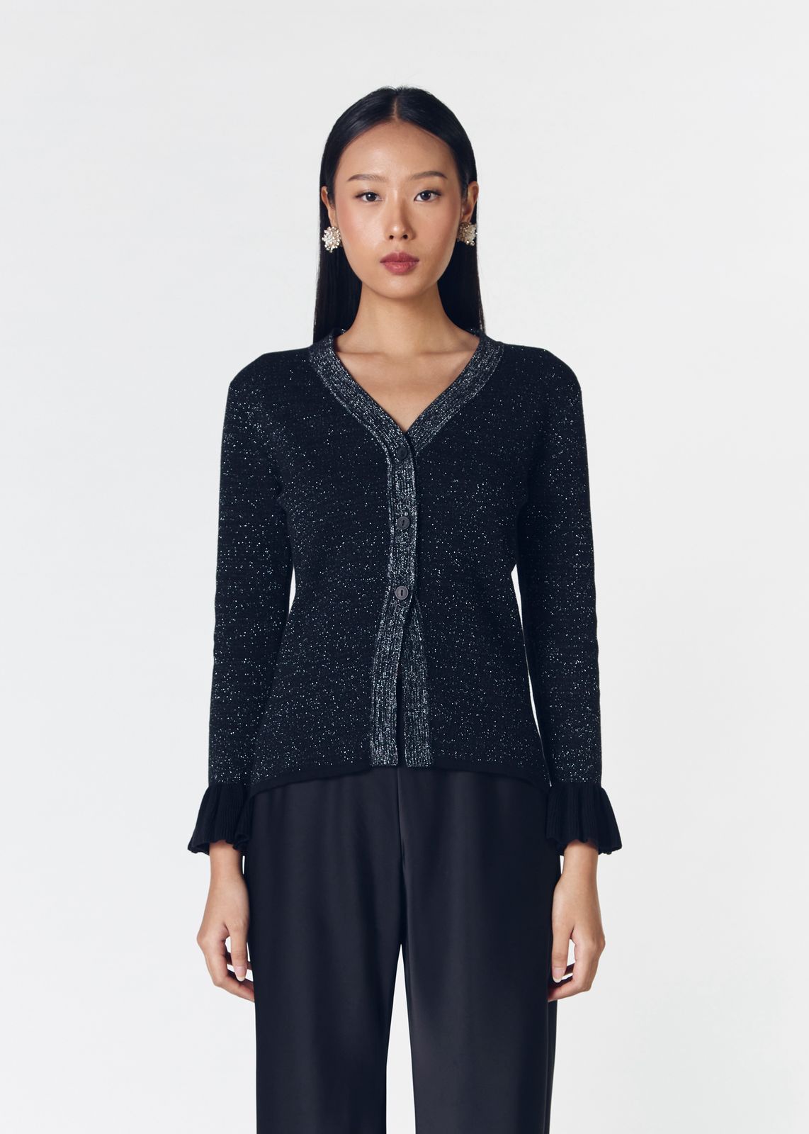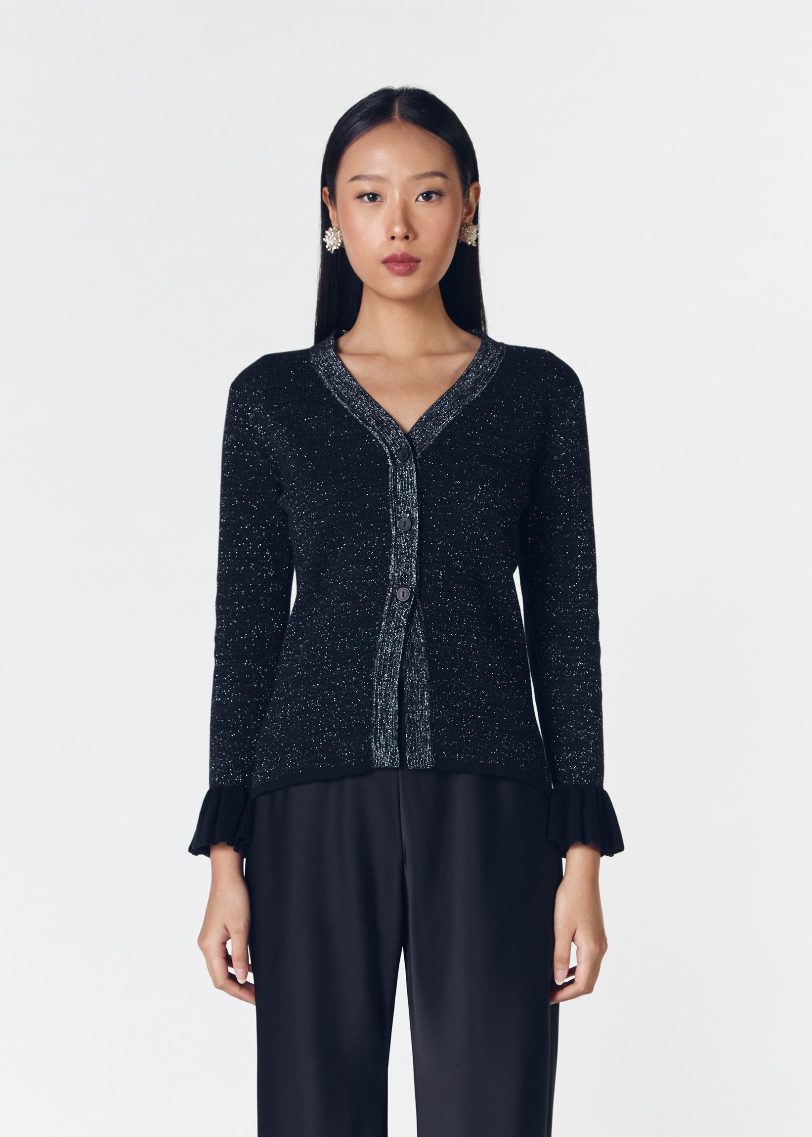Long sleeve knit top with V neckline and ruffles detail on the sleeves.