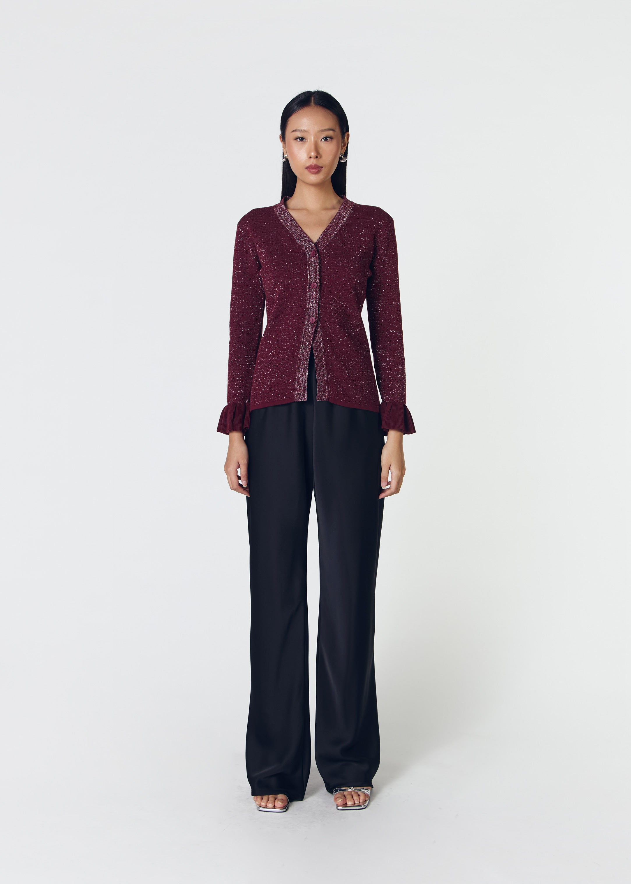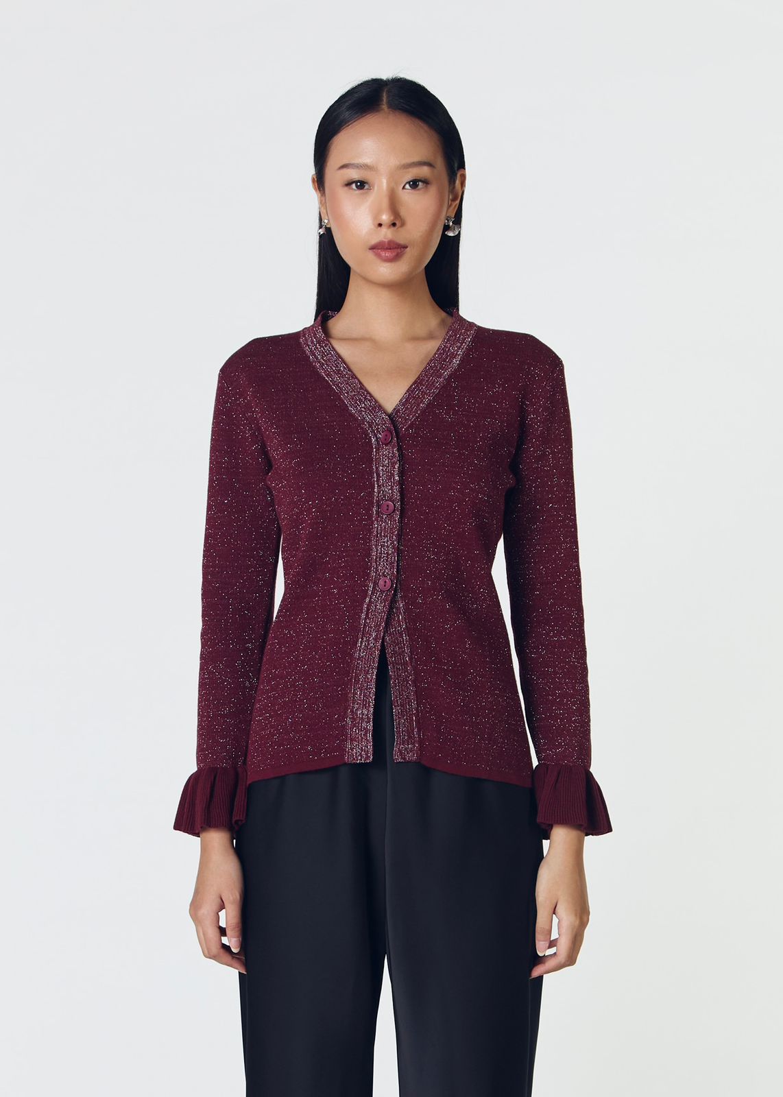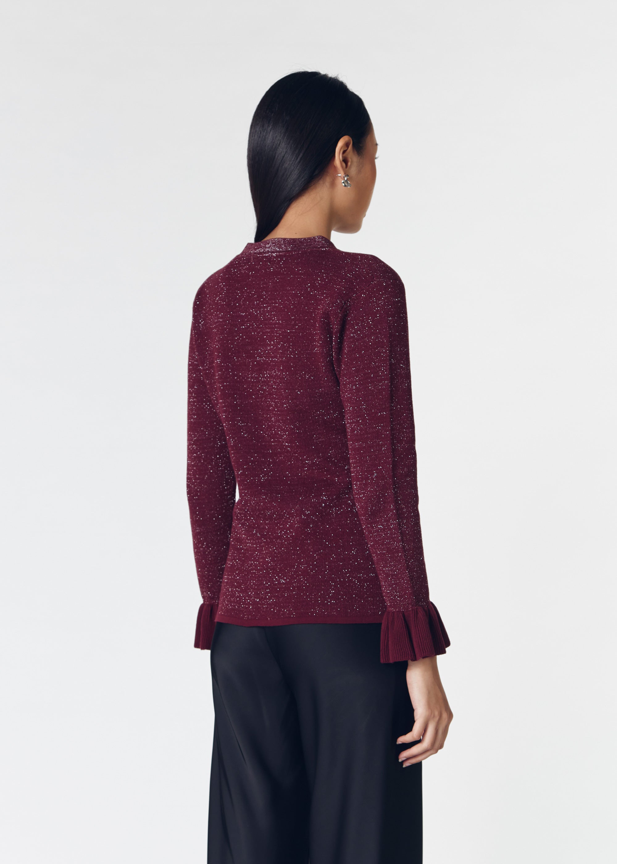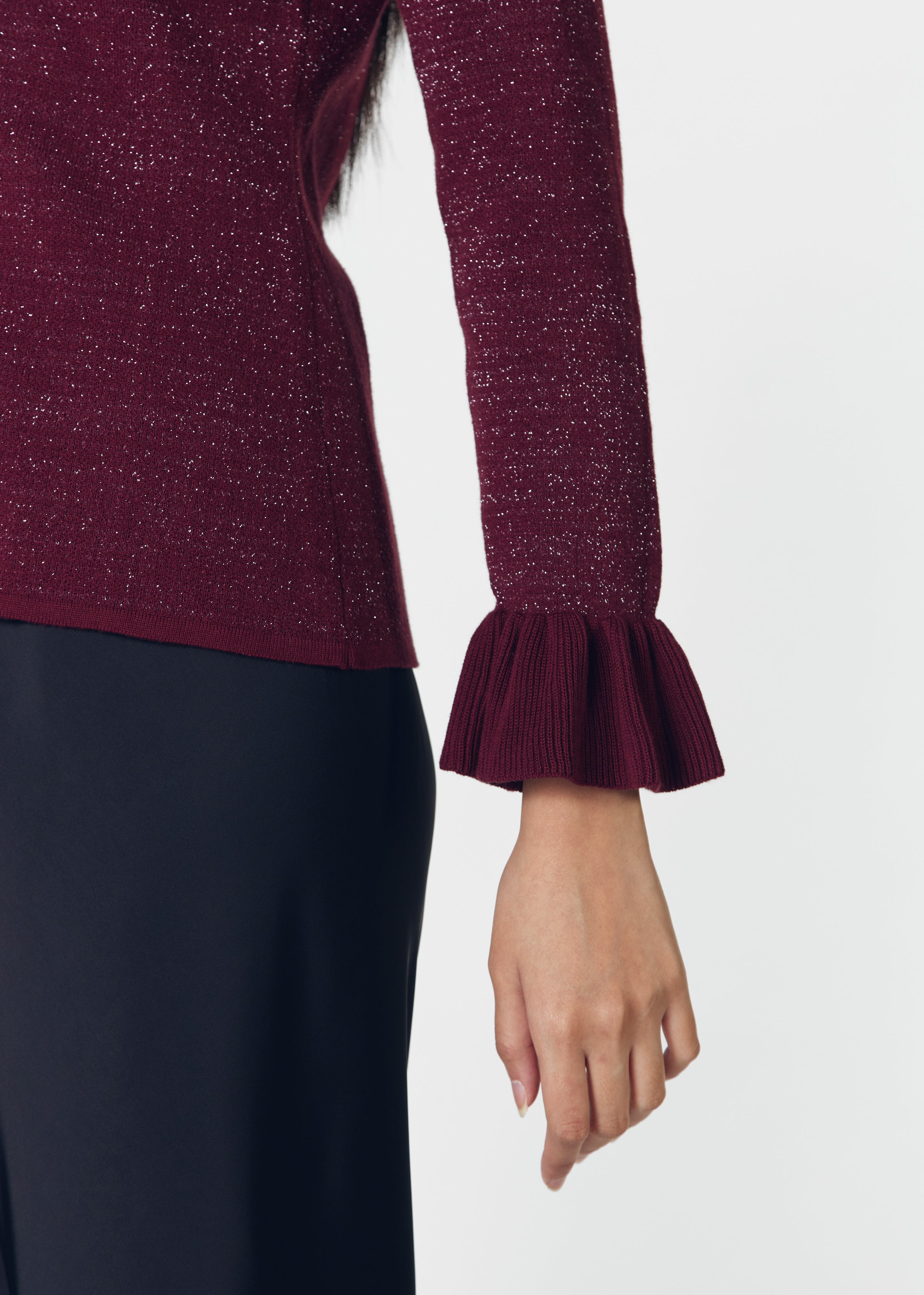 Long sleeve knit top with V neckline and ruffles detail on the sleeves.