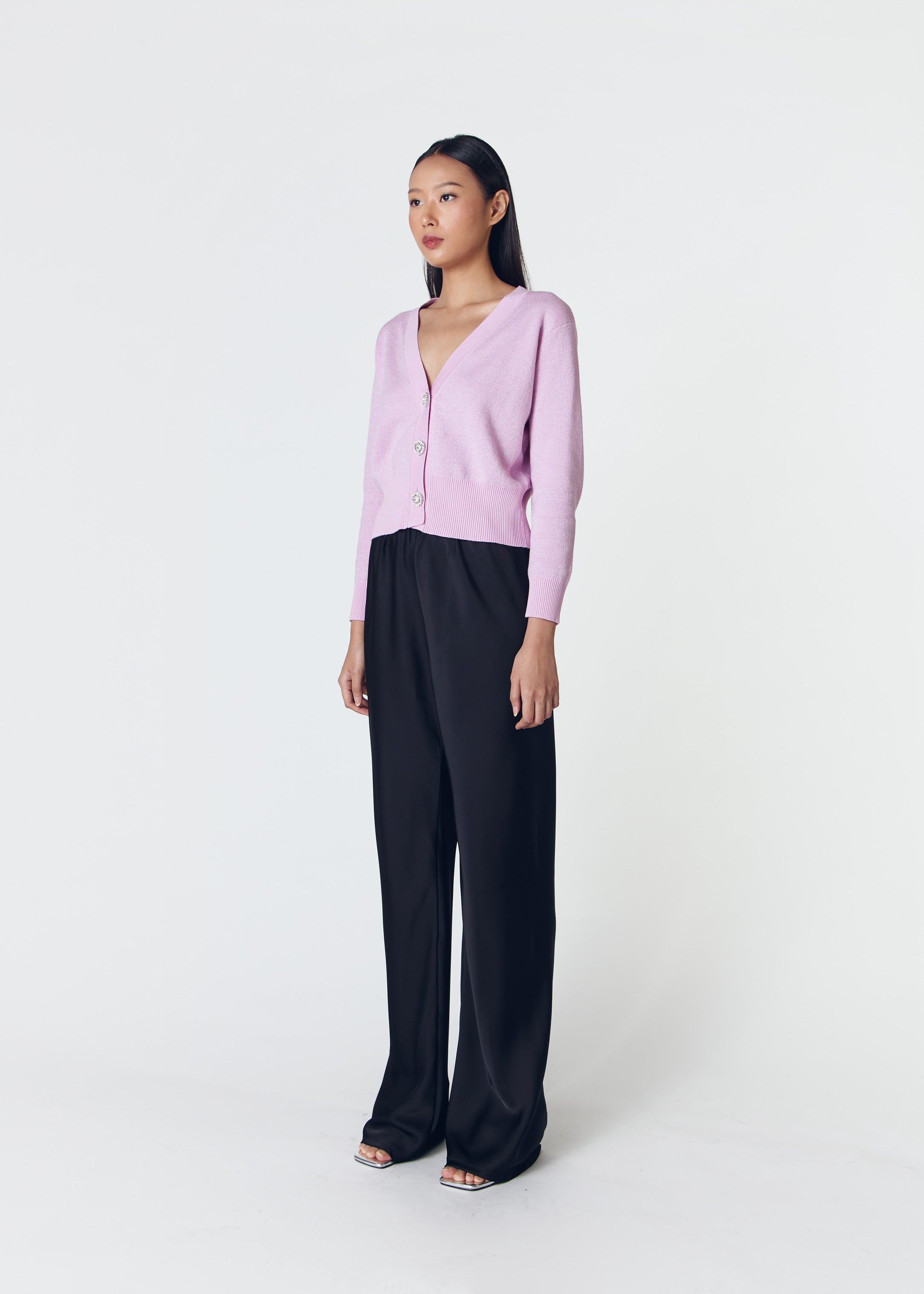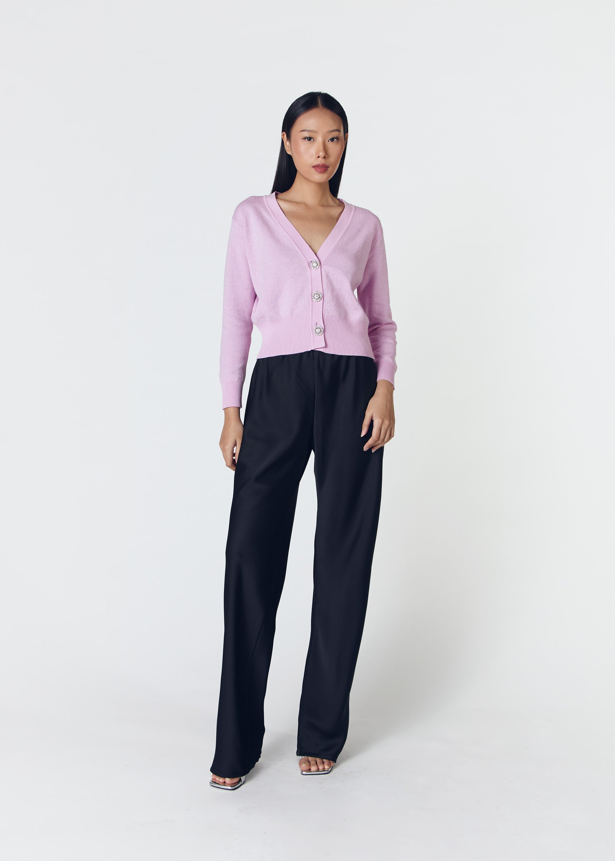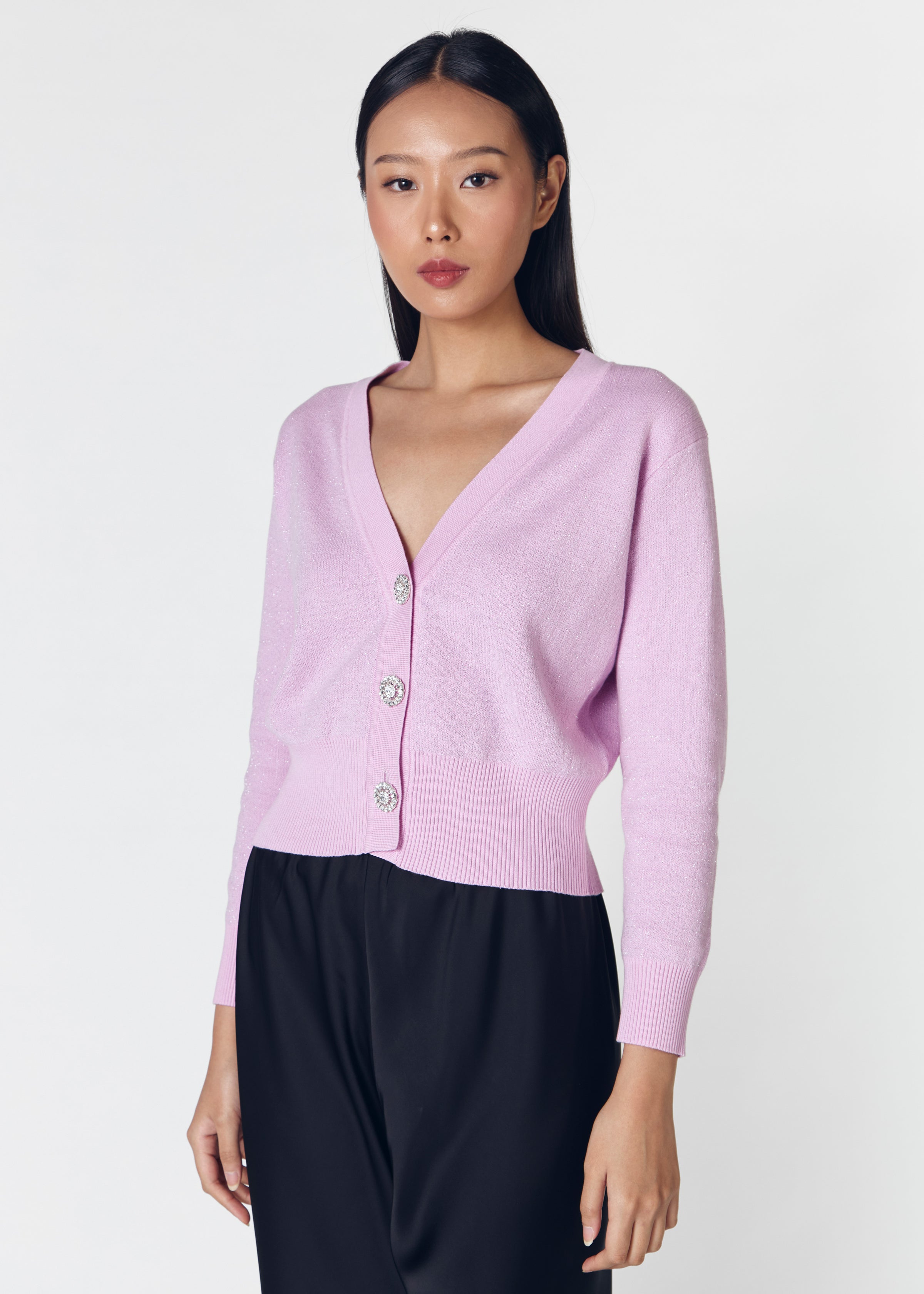 Long sleeve knit top with V neckline and decorative buttons on the front.