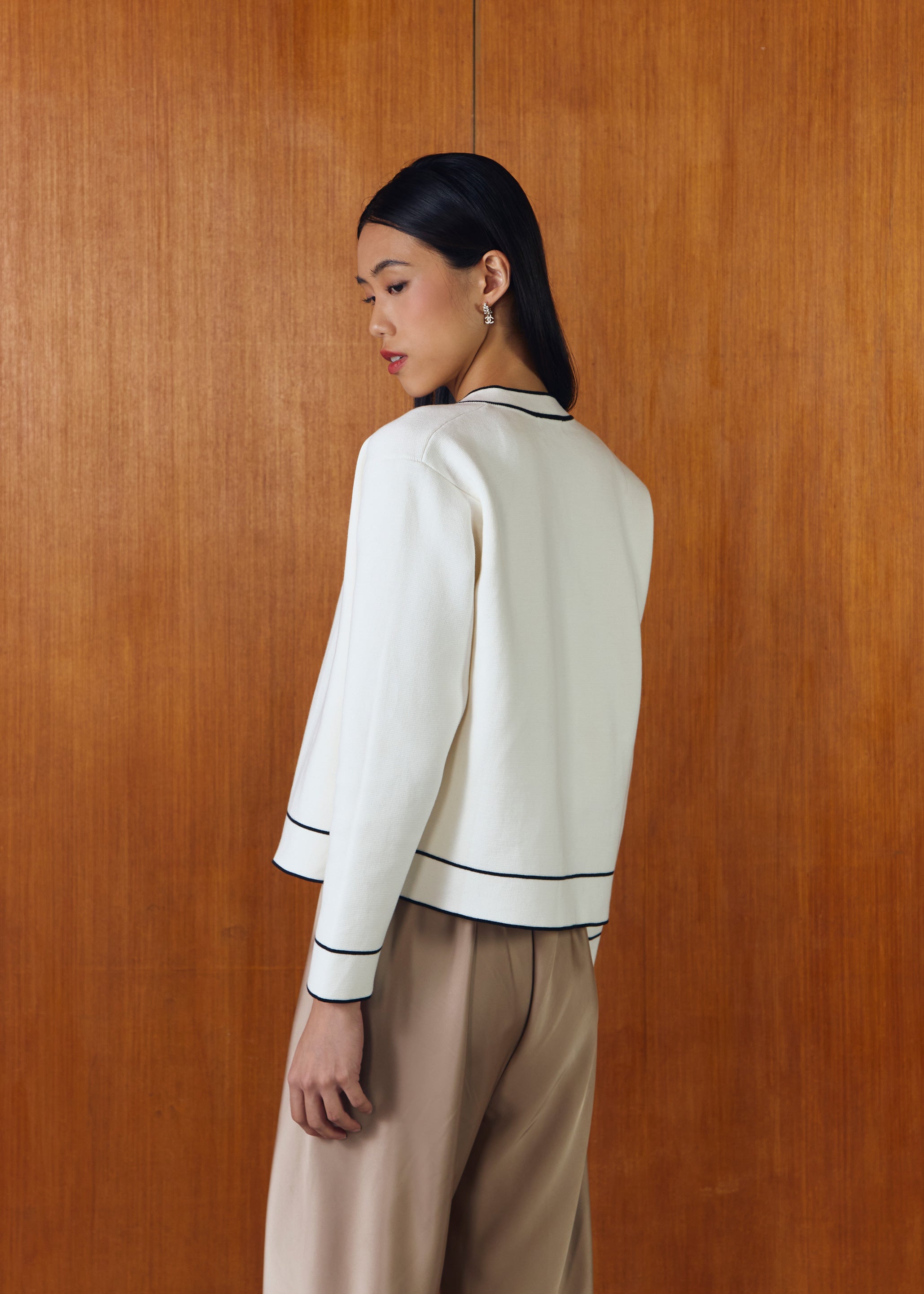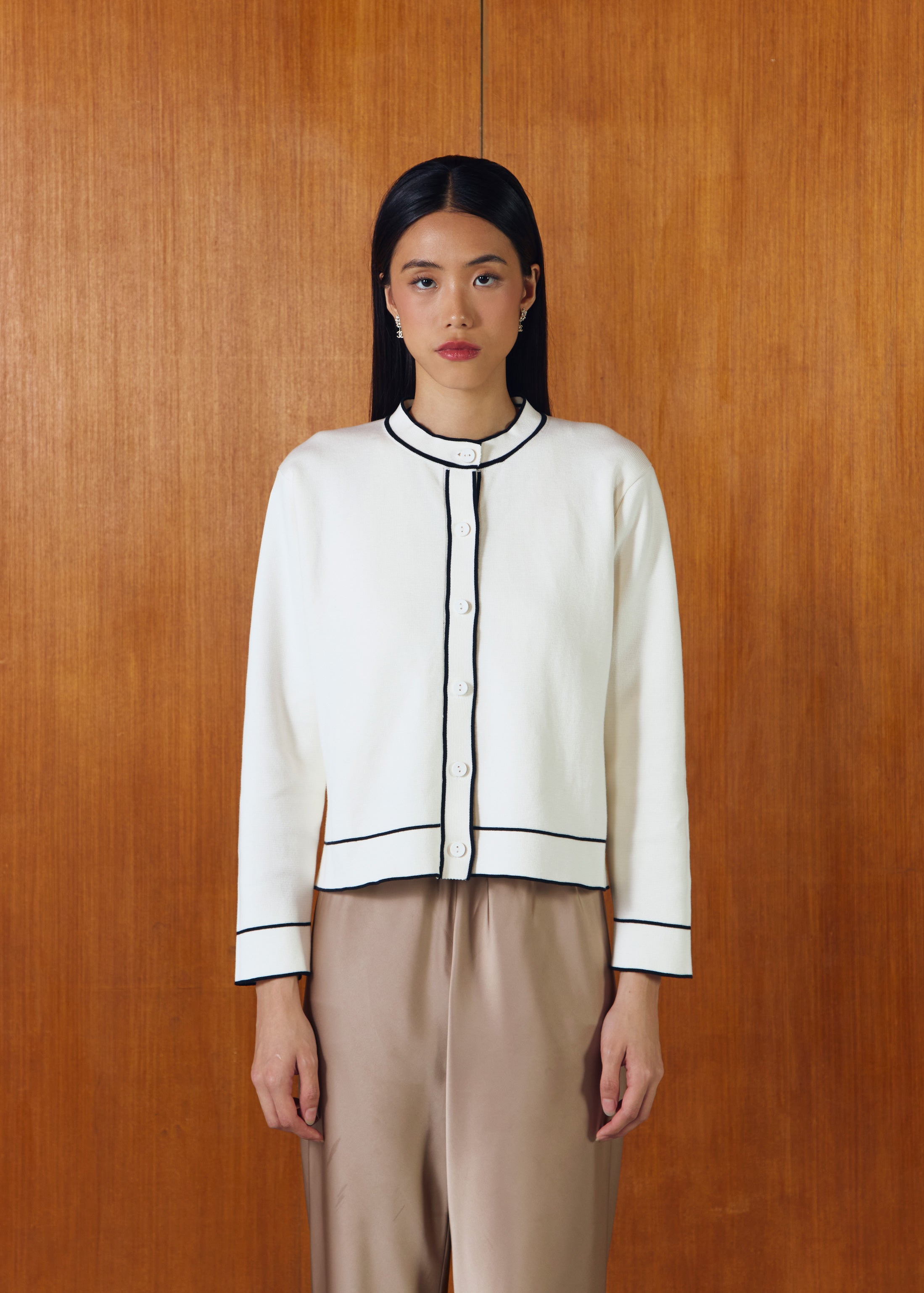 Long sleeves knit top with contrast list details and front buttons opening.