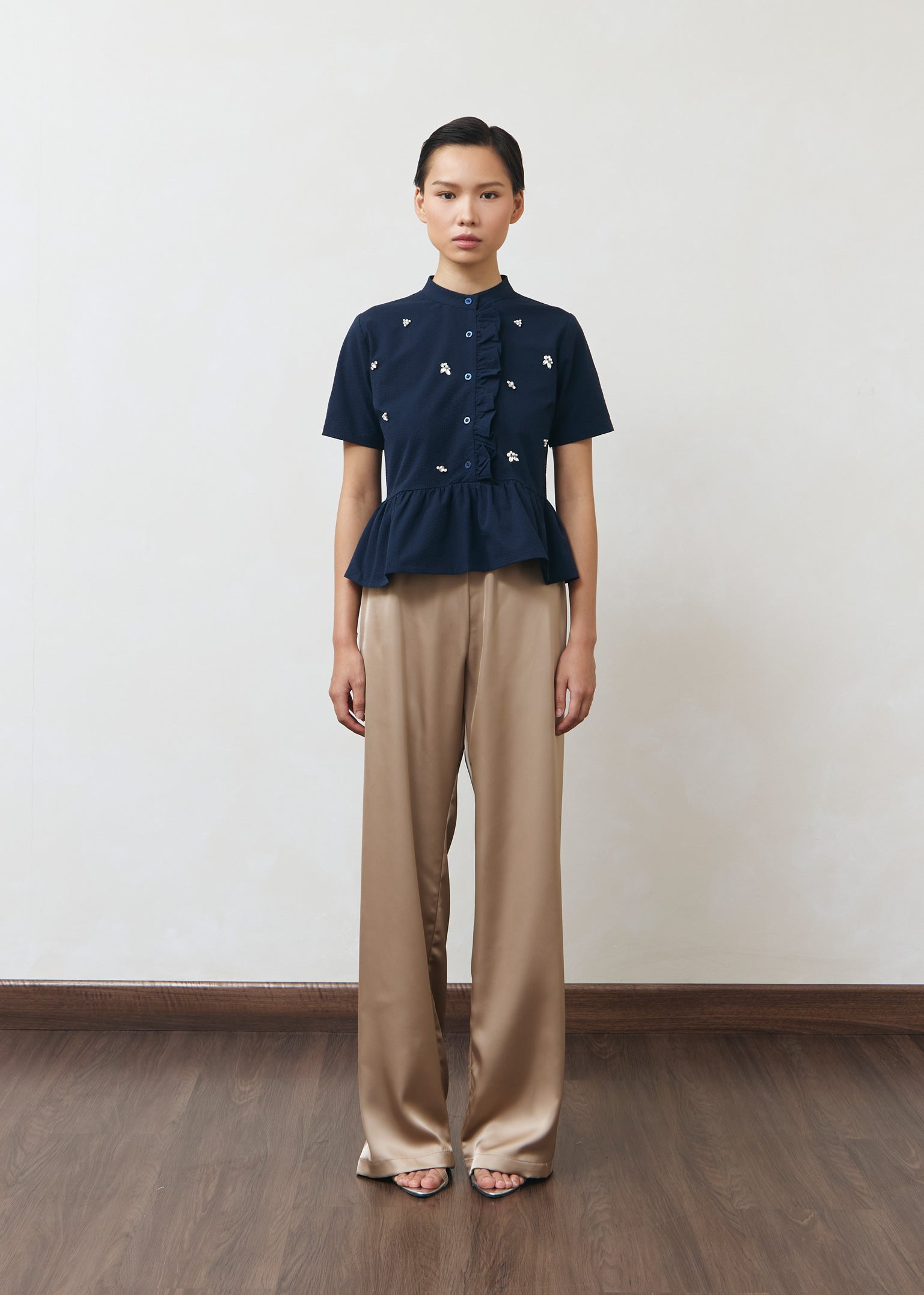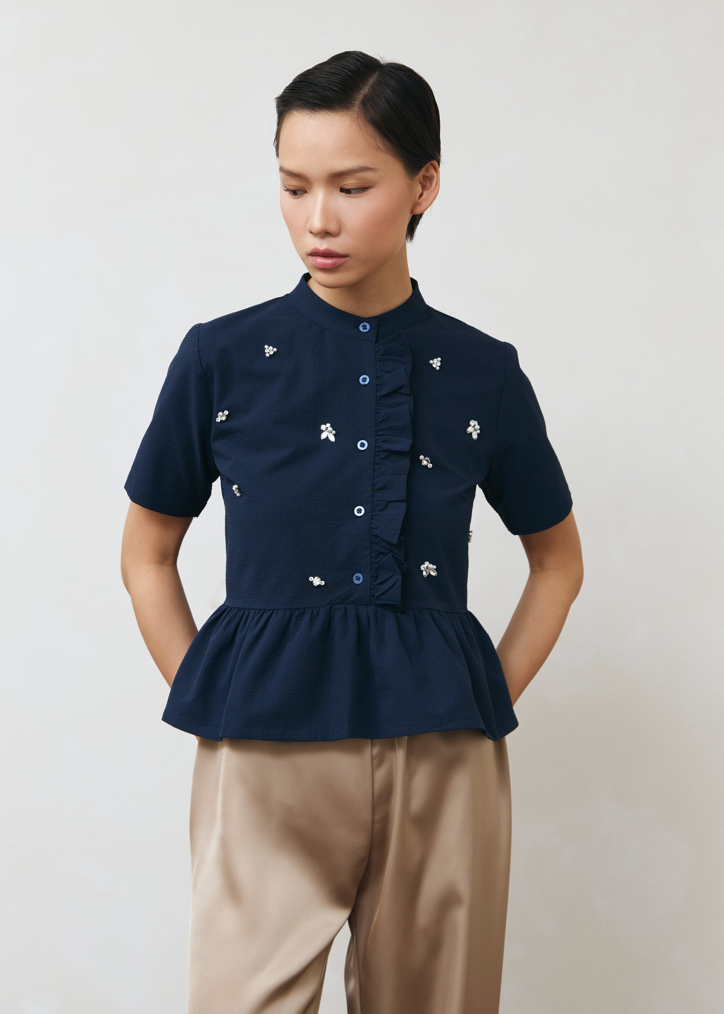 Short sleeves peplum top with ruffles and silver beadings details on the front.