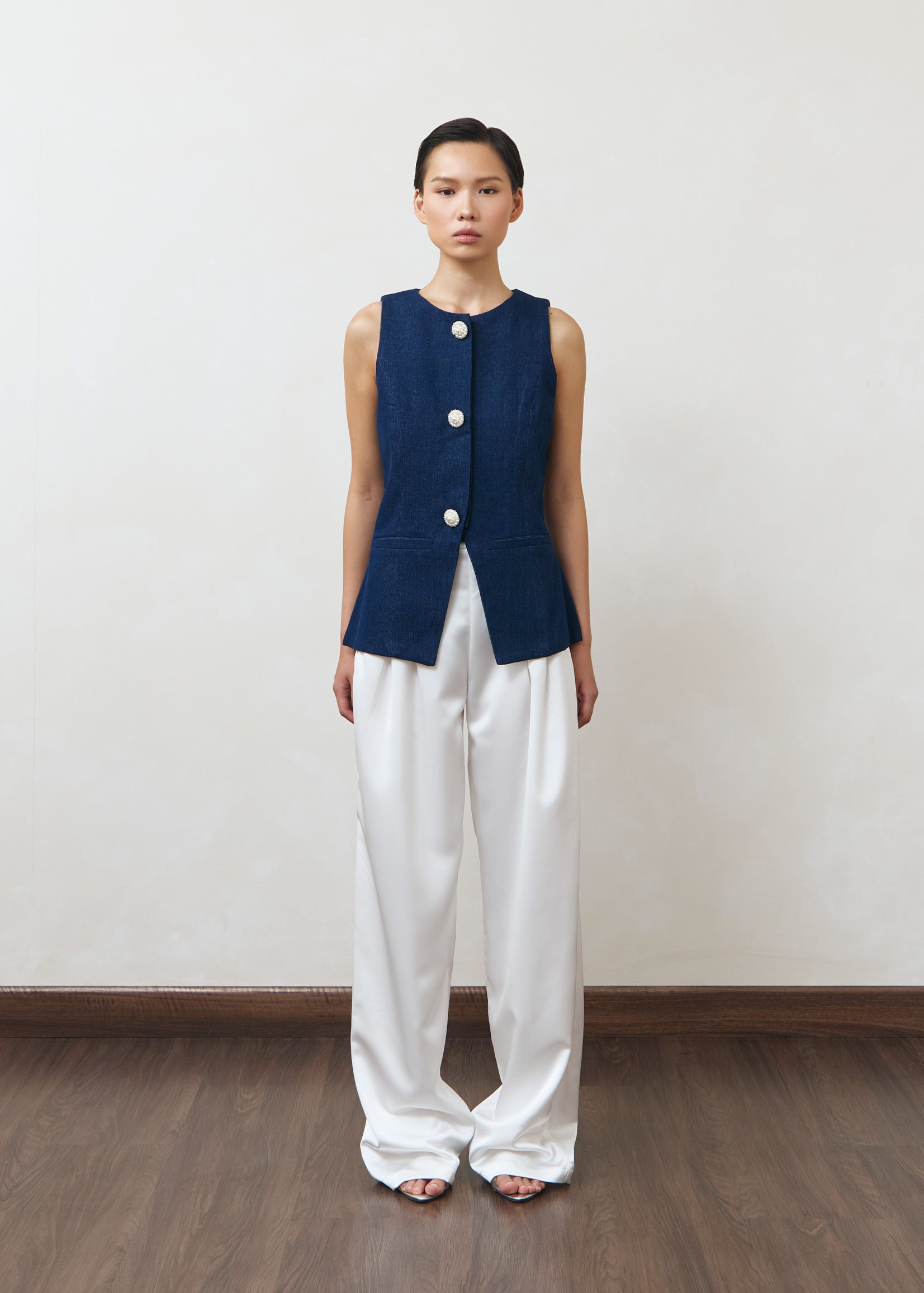 Sleeveless denim top with pearl buttons on the front and strap adjuster at the back.